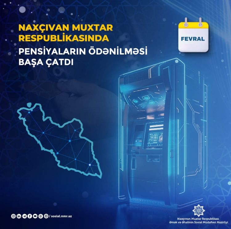 Naxçıvan Muxtar Respublikası Əmək və Əhalinin Sosial Müdafiəsi Nazirliyinin tabeliyində Dövlət Sosial Müdafiə Fondu tərəfindən fevral ayının pensiya ödənişi başa çatdırılıb.
