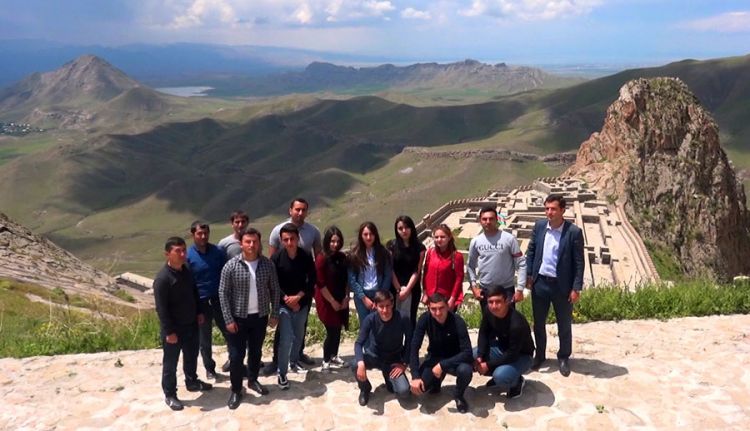 Gənclər qalanın zirvəsinə qalxıb, burada xatirə şəkli çəkdiriblər.