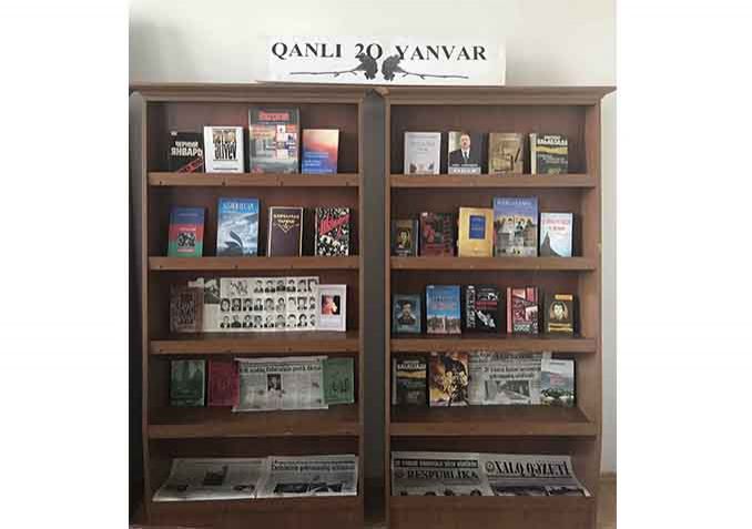 “Qanlı 20 Yanvar” başlığı altında təşkil edilən sərgidə “Heydər Əliyev müstəqilliyimiz əbədidir”, “Azərbaycan tarixi”, “Naxçıvan 20 yanvar ərəfəsində”, “Şahbuzlu şəhidlər”, “Sədərək harayı”, “Qələbəyə gedən yol”, “Ermənilər və həqiqətlər”, “Qara Yanvar Bakı-1990”, “Şənbə gecəsinə gedən yol”, “Ülviləşən Ülvim”, “Analar anar ağlar” və digər bu qəbildən olan kitablar nümayiş olunur. Sərgi bu ayın sonuna kimi ziyarətçilərin ixtiyarında olacaq.