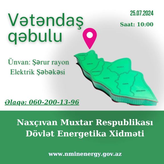 NUHÇIXAN xəbər verir ki, Naxçıvan Muxtar Respublikası Dövlət Energetika Xidməti rəisinin müavini Tural Murtuzəliyev iyulun 25-də saat 10:00-11:00-da Şərur Rayon Elektrik Şəbəkəsinin inzibati binasında vətəndaşları qəbul edəcək.
