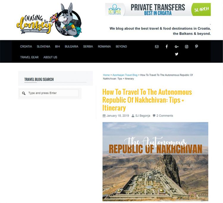 NUHÇIXAN xəbər verir ki, Xorvatiyanın “Chasinqthedonkey” turizm saytında Naxçıvanla bağlı geniş yazı yer alıb. Daha çox Balkan ölkələrinin və qonşu Avropa dövlətlərinin turizmini təbliğ edən saytda verilən məqalədə Naxçıvanın turizm imkanları, buradakı 4-5 ulduzlu hotellər, gəzmək və istirahət etmək üçün marşrutlar barədə ətraflı bəhs edilir. 4 gün ərzində Naxçıvanı turist kimi gəzən yazı müəllifi hər günün maraqlı və yaddaqalan olduğunu bildirir. Möminə xatın, Qarabağlar, Nuh peyğəmbərin məzarüstü türbələri, Batabatın gözəlliyi, dağ zirvəsində qərar tutan Cənubi Amerikadakı Maçu-Piçunun ekizi olan qədim qala Əlincəqalanın məğrurluğu, Ordubad şəhərinin qədim məhəllələri və qonaqpərvərliyi yazıda xüsusi olaraq vurğulanıb. Naxçıvanı görmək istəyən avropalı turistlərə burada nəqliyyat infrastrukturu və marşrutlar haqda da məlumat verilir. Qeyd olunur ki, daha çox taksi xidmətlərindən istifadə etsinlər. Çünki bu xidmət həm ucuz, həm də sərfəlidir. Naxçıvan bazarlarındakı meyvə və tərəvəz isə dünyanın ən təmiz və təbii qidası kimi qiymətləndirlir. Naxçıvanın 2018-ci ildə İslam Mədəniyyətinin Paytaxtı elan olunması və buradakı məscidlərin memarlıq üslubu, abidələrin gözəlliyi də diqqətdən yayınmayıb. Müəllif onu da qeyd edir ki, şəhərin sakitliyi, səliqəsi və təmizliyi indiyə qədər gəzdiyi Asiya ölkələrinin heç birində qarşısına çıxmayıb.