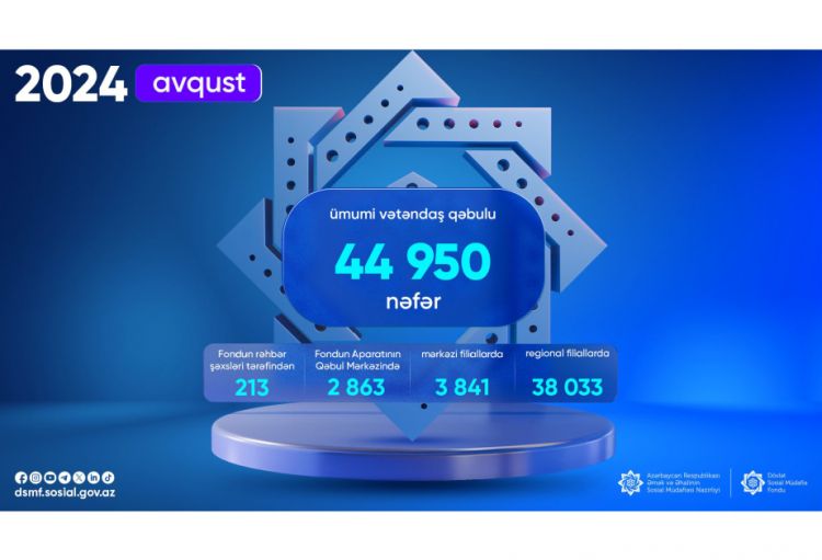 2024-cü ilin avqust ayında Dövlət Sosial Müdafiə Fondunun (DSMF) fəaliyyət istiqamətləri üzrə ümumilikdə 44 min 950 vətəndaş qəbul edilib və onların müraciətləri cavablandırılıb.
