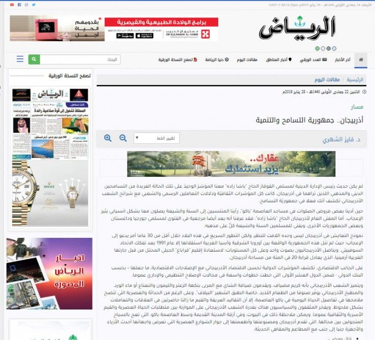 Səudiyyə Ərəbistanının “Ər-Riyad” qəzetində “Azərbaycan tolerantlıq və inkişaf respublikasıdır” adlı məqalə dərc olunub.