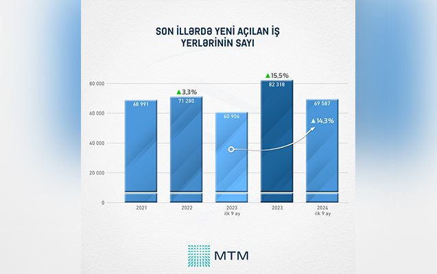 Rəsmi rəqəmlərə əsasən, 2024-cü ilin ilk 9 ayında ölkədə 69 587 yeni iş yeri açılıb və bu göstərici ötən ilin eyni dövrü ilə müqayisədə 14,3% çox olub.