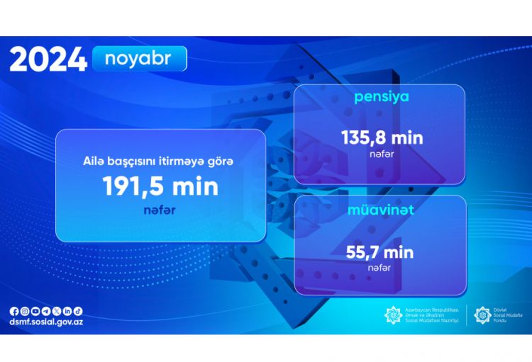 Bu ilin noyabr ayında ailə başçısını itirməyə görə 191,5 min şəxsə pensiya və müavinət ödənilib.