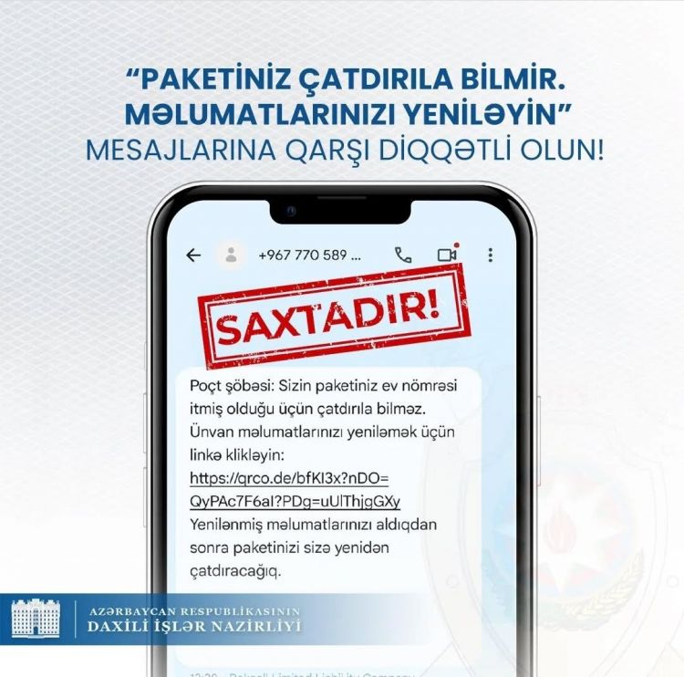 "İtmiş məlumatlara görə çatdırıla bilməyən yük və ya bağlama olduğunu bildirən yanlış mesajlara etibar etməyin. Mesajda yönləndirilən saxta linklərə keçid etməyin. Yeniləmə adı altında yaradılmış saxta formaları doldurmayın, şəxsi və kart məlumatlarınızı paylaşmayın", - müraciətdə bildirilib.