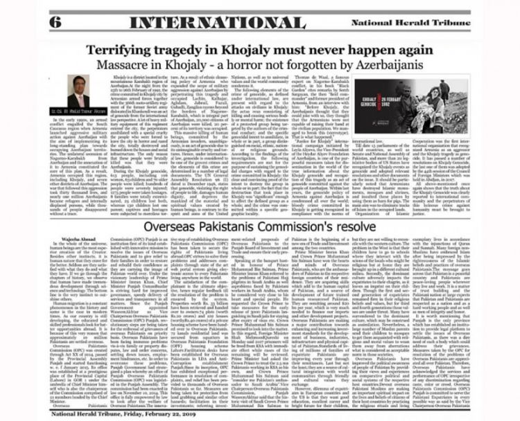 Pakistanın “National Herald Tribune” və “Morning Mail” qəzetləri və elektron portalları “Xocalıdakı dəhşətli faciə bir daha baş verməməlidir”, “Xocalı soyqırımının qurbanlarını xatırlayarkən” sərlövhəli məqalələr yayıb.