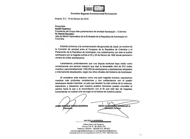 Xocalı soyqırımı ilə əlaqədar Kolumbiya parlamentinin beynəlxalq əlaqələr komitəsinin sədri Xaime Duran və həmin komitənin baş katibi Dieqo Alexandro Qonzalez tərəfindən ölkəmizin Boqotadakı səfirliyinə başsağlığı məktubu ünvanlanıb.