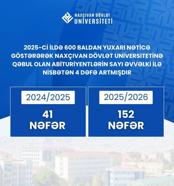 Bu göstərici əvvəlki illə müqayisədə əhəmiyyətli artım deməkdir. Xatırladaq ki, 2024-2025-ci tədris ilində bu rəqəm 41 nəfər idi. Məlumat üçün bildirək ki, müxtəlif ixtisas qrupları üzrə 600-dən yuxarı bal toplayan abituriyentlər NDU-nun “Hüquqşüaslıq”, “Tibb”, “Dövlət və ictimai münasibətlər”, “Komputer mühəndisliyi” və s. ixtisaslarda təhsil almaq imkanı əldə ediblər. Həmçinin 600 baldan yuxarı nəticə göstərən abituriyentlər arasında NDU-nun “Riyaziyyat müəllimliyi” ixtisasını seçən tələbələr də yer alır.
