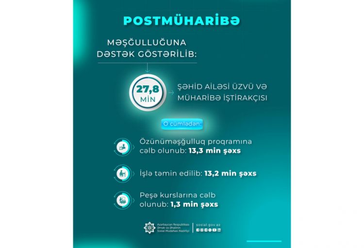 Möhtəşəm Zəfərlə yekunlaşan 44 günlük Vətən müharibəsindən sonrakı dövrdə dövlətimizin başçısının tapşırıqları əsasında şəhid ailələrinin üzvləri və müharibə iştirakçıları ilə bağlı icra olunan genişmiqyaslı sosial dəstək paketinin icrası davam etdirilir. Əmək və Əhalinin Sosial Müdafiəsi Nazirliyinin tabeliyində Dövlət Məşğulluq Agentliyi tərəfindən postmüharibə dövründə bu kateqoriyalara aid olan 27 min 800 nəfər məşğulluq tədbirlərinə cəlb edilib.