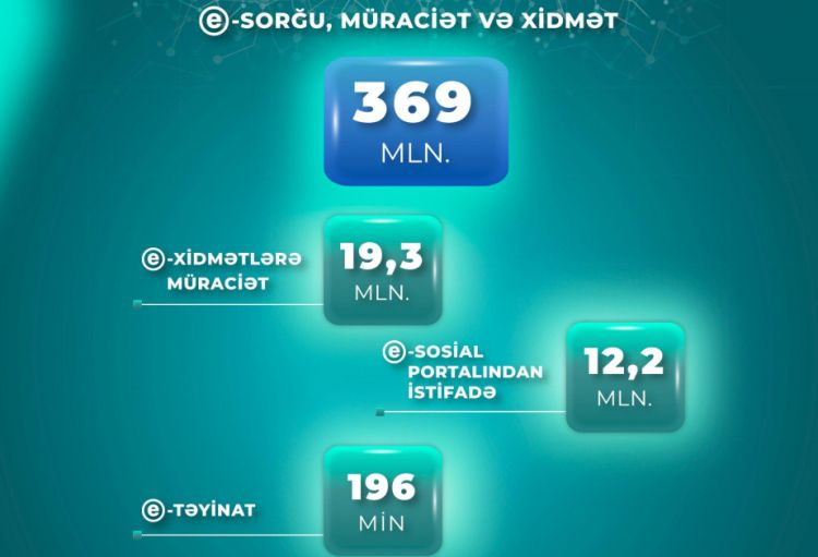 Nazirliyin e-sistemlərinin 80-dək qurumun informasiya bazaları ilə inteqrasiyası həyata keçirilir. Həmin qurumlardan sorğular da daxil olmaqla, cari ilin 9 ayı ərzində nazirliyin e-sistemləri üzərindən sorğu, müraciət və xidmət sayı 369 milyon olub.