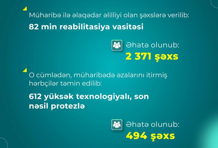 Prezident İlham Əliyevin tapşırığına əsasən, müharibə ilə əlaqədar əlilliyi olanların sosial dəstəklə əhatə olunması işlərinin bir istiqaməti də onların reabilitasiya vasitələri ilə təmin olunmasıdır. Möhtəşəm Zəfərlə başa çatan Vətən müharibəsindən sonrakı dövrdə Əmək və Əhalinin Sosial Müdafiəsi Nazirliyi tərəfindən müharibə ilə əlaqədar əlilliyi olan 2371 şəxsə 82 min reabilitasiya vasitəsi verilib.