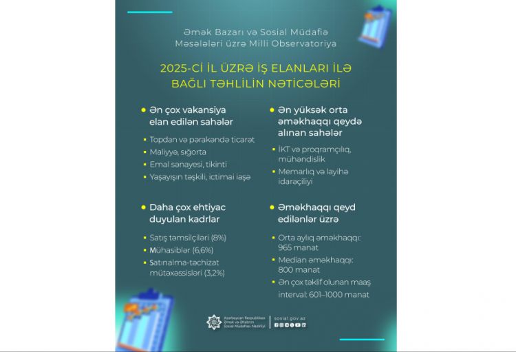 Əmək və Əhalinin Sosial Müdafiəsi Nazirliyinin tabeliyindəki Əmək Bazarı və Sosial Müdafiə Məsələləri üzrə Milli Observatoriya tərəfindən 2025-ci il üzrə iş elanlarının təhlili aparılıb. Təhlilin nəticələrinə əsasən ölkənin əmək bazarındakı əsas tendensiyalar və tələbat istiqamətləri müəyyən edilib.