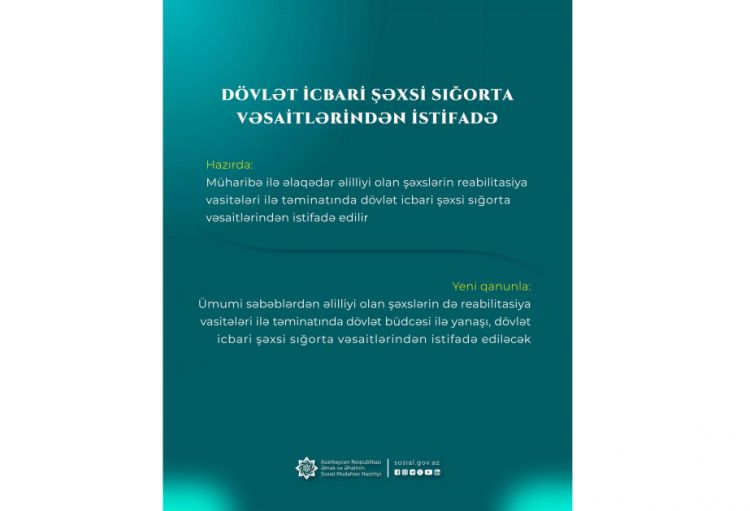 Belə ki, ümumi səbəblərdən əlilliyi olan şəxslərin reabilitasiya vasitələri ilə təminatı dövlət büdcəsi ilə yanaşı, dövlət icbari şəxsi sığorta üzrə toplanan vəsait hesabına da həyata keçiriləcək.