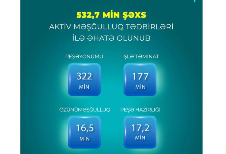 Nazirliyin İctimaiyyətlə əlaqələr şöbəsindən NUHÇIXAN-a verilən məlumata görə, onlardan 177 min şəxs münasib işlərlə təmin olunub, 16 min 500 şəxs isə kiçik ailə təsərrüfatlarını yaratmaq üçün özünüməşğulluq proqramına cəlb olunub.