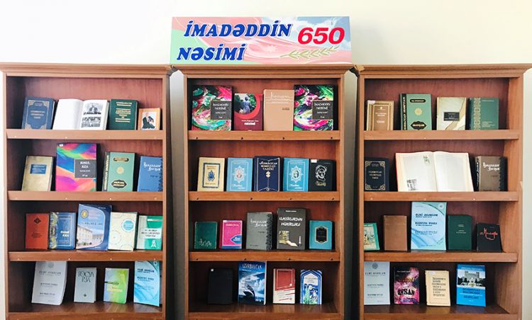 “İmaməddin Nəsimi-650” başlıqlı sərgidə “Heydər Əliyev və Azərbaycan ədəbiyyatı”, 3 cildlik “Azərbaycan ədəbiyyatı tarixi”, “Azərbaycan klassik ədəbiyyatından seçmələr”, “İmaməddin Nəsimi seçilmiş əsərləri”, “Nəsimi divanının leksikası”, “Nəsimi”, “Dilin estetikası”, “Azərbaycan ədəbiyyatının qaynaqları”, “XIII-XIV əsrlər ana dilli lirik şeirimizin inkişaf yolu”, “Azərbaycan ədəbiyyatı: tarixi və problemləri”, “Evrene sığmayan ozan Nesimi” və digər bu qəbildən olan kitablar nümayiş olunur.