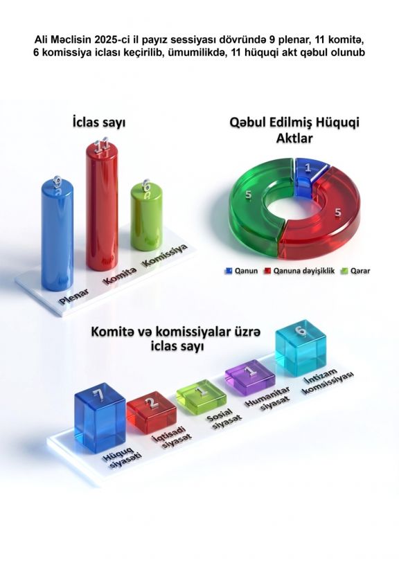 Eyni zamanda, qanunvericilik prosesinin təkmilləşdirilməsi məqsədilə 11 komitə və 6 komissiya iclası təşkil olunub. Aparılan müzakirələr və baxılan məsələlərin nəticəsi olaraq, müxtəlif sahələri əhatə edən 11 hüquqi akt qəbul edilib.