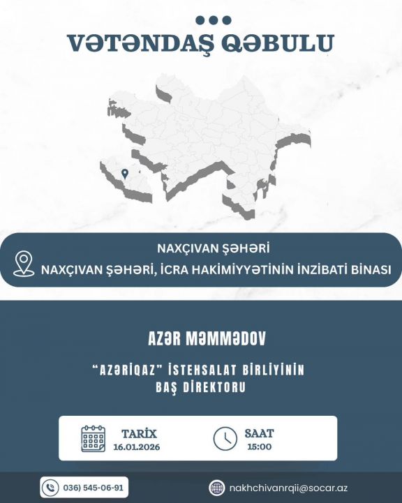 Qəbul sabah saat 15:00-da Naxçıvan Şəhər İcra Hakimiyyətinin inzibati binasında baş tutacaq.