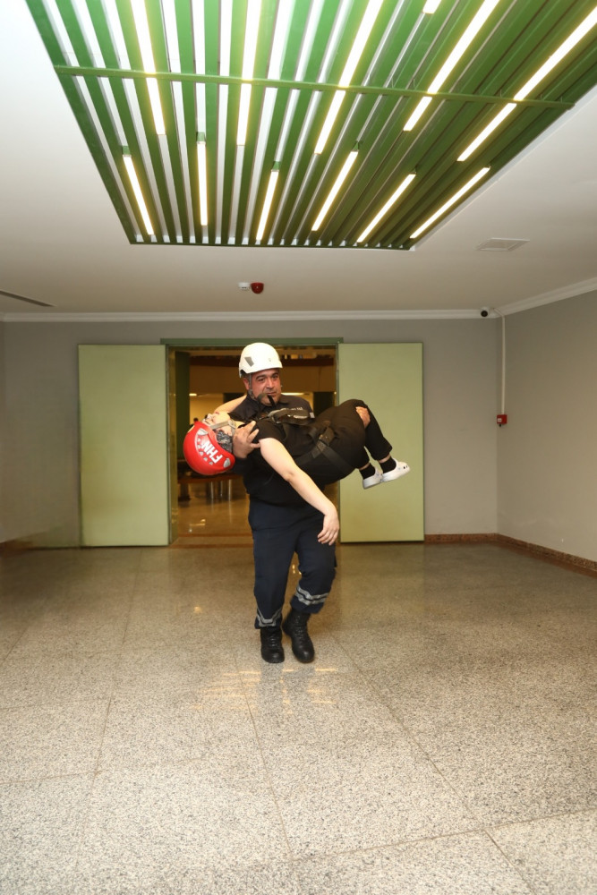 Sonra təlimin praktiki hissəsinə start verilib. Belə ki, şərti yanğın zamanı “Həyəcan” siqnalı verildikdən sonra FHN-in yanğın-xilasetmə bölmələri operativ qaydada hadisə yerinə çataraq xəstəxananın müvafiq personalı ilə əlaqəli şəkildə obyektin təxliyə planına uyğun insanların təhlükəsiz yerə təxliyəsini həyata keçirib, paralel olaraq “yanğınla mübarizə” tədbirləri yerinə yetirilib, habelə şərti xəsarət almış şəxslərə “ilkin yardım göstərilib”.