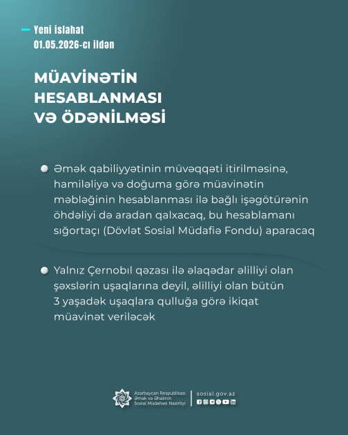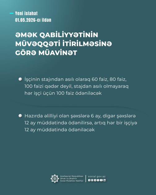 Yeni islahat tədbiri nəticəsində, həmçinin sığortaolunanın stajından asılı olaraq hazırda ona əmək qabiliyyətinin müvəqqəti itirilməsinə görə müavinət 60, 80, 100 faizi qədər ödənilirsə, stajından asılı olmayaraq hər bir işçiyə 100 faiz məbləğində ödəniləcək. Əmək qabiliyyətinin müvəqqəti itirilməsinə görə müavinət hazırda əlilliyi olan şəxslərə 6 ay, digər şəxslərə 12 ay müddətində ödənilirsə, artıq hər bir işçiyə 12 ay müddətində ödəniləcək. Yalnız Çernobıl qəzası ilə əlaqədar əlilliyi olan şəxslərin uşaqlarına qulluğa görə ikiqat müavinət ödənilirsə, artıq əlilliyi olan bütün uşaqlara qulluğa görə ikiqat müavinət veriləcək. Əmək qabiliyyətinin müvəqqəti itirilməsinə, hamiləliyə və doğuma görə müavinətin məbləğinin hesablanması ilə bağlı işəgötürənin öhdəliyi də aradan qalxacaq, bu hesablamanı sığortaçı (DSMF) aparacaq.