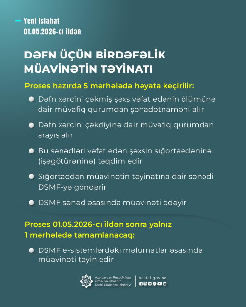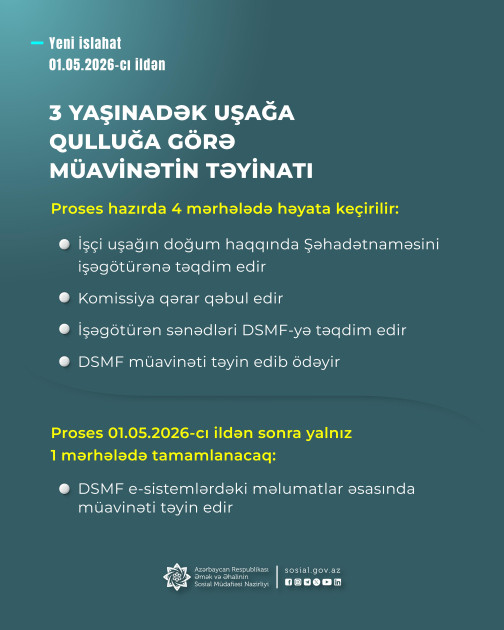 Bununla da həmin müavinətlərin təyinatı üçün işçinin müraciətinə, müxtəlif sənədlər toplayıb təqdim etməsinə ehtiyac qalmayacaq, işəgötürənin bir sıra əlavə öhdəlikləri (komissiya yaradılması, protokol, haqq-hesab cədvəli s. sənədlərin tərtibi, təqdim edilməsi) aradan qalxacaq. Məsələn, 3 yaşınadək uşağa qulluğa görə müavinət təyinatı üçün prosedur 4 mərhələdən (işçinin uşağın doğum haqqında şəhadətnaməsini işəgötürənə təqdim etməsi, komissiyanın qərar qəbul etməsi, işəgötürənin sənədləri Dövlət Sosial Müdafiə Fonduna (DSMF) təqdim etməsi, fondun müavinəti ödəməsi) ibarətdirsə, mayın 1-dən bu prosedur yalnız 1 mərhələ (e-sistemlərdəki məlumatlar əsasında müavinətin təyin edilməsi) ilə tamamlanacaq.