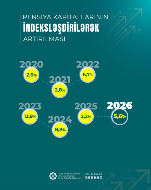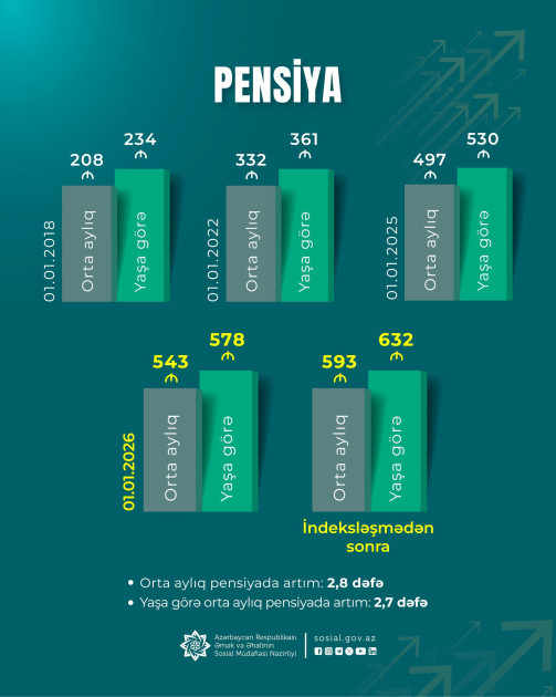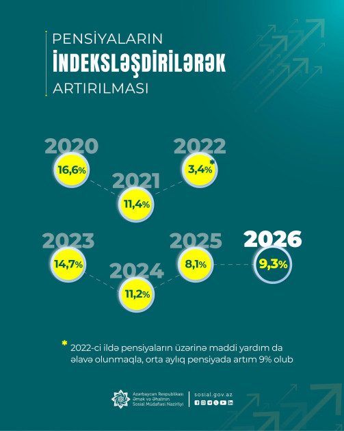 Həmin artımlarda minimum pensiya artımı ilə yanaşı, hər ilin əvvəlindən indeksləşdirmə əsasında artımların edilməsi mühüm rola malikdir. Məsələn, bu artımlar 2020-ci ildə 16,6 faiz, 2021-ci ildə 11,4 faiz, 2022-ci ildə 3,4 faiz (pensiyalara maddi yardım əlavə olunmaqla orta pensiya artımı 9 faiz olub), 2023-cü ildə 14,7 faiz, 2024-cü ildə 11,2 faiz, 2025-ci ildə 8,1 faiz və bu il 9,3 faiz təşkil edib.