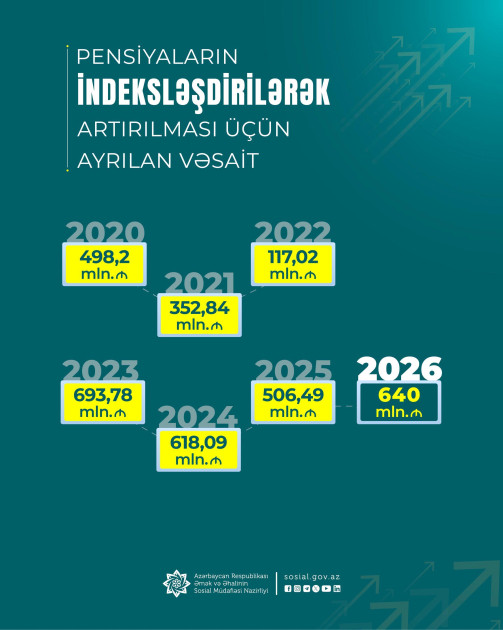 Pensiyalarda indeksasiya əsasında artımlar üçün əlavə olaraq hər il ayrılan vəsaitlər isə 2020-ci ildə 498,2 milyon manat, 2021-ci ildə 352,84 milyon manat, 2022-ci ildə 117,02 milyon manat, 2023-cü ildə 693,78 milyon manat, 2024-cü ildə 618,09 milyon manat, 2025-ci ildə 506,49 milyon manat və bu il 640 milyon manatdır.