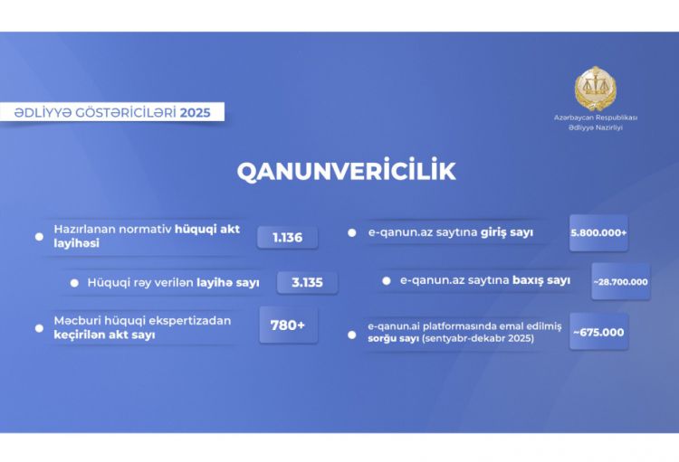 Azərbaycanda qanunvericilik bazasının təkmilləşdirilməsi məqsədilə 2025-ci il ərzində Ədliyyə Nazirliyi tərəfindən 1136 normativ-hüquqi akt layihəsi hazırlanıb. Həmçinin müvafiq dövlət orqanları tərəfindən nazirliyə təqdim edilmiş 3135 hüquqi akt layihəsinə hüquqi rəy verilib.