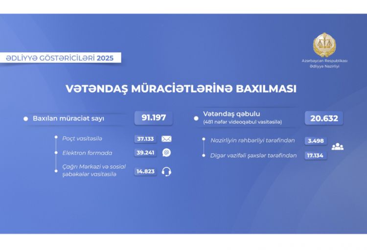 Ötən il Ədliyyə Nazirliyinin Aparatında vətəndaşlar tərəfindən ünvanlanmış 91 min 197 müraciətə qanunvericiliyin tələblərinə uyğun olaraq baxılıb. Müraciətlərin 37 min 133-ü poçt, 39 min 241-i elektron formada daxil olub. “881” Çağrı Mərkəzi, eləcə də nazirliyin sosial şəbəkə hesabları vasitəsilə daxil olmuş 14 min 823 müraciət isə qanunvericiliyə uyğun olaraq qeydiyyata alınaraq baxılıb.