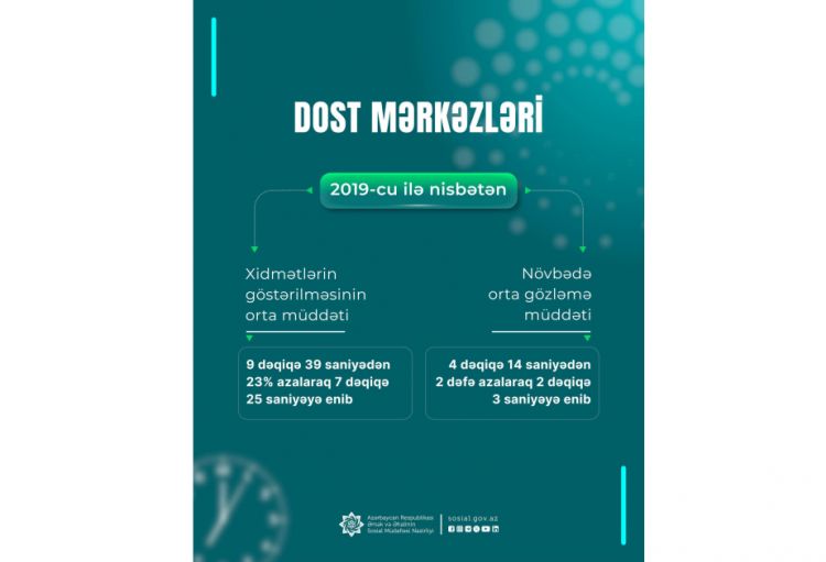 Əmək və Əhalinin Sosial Müdafiəsi Nazirliyinin İctimaiyyətlə əlaqələr şöbəsindən NUHÇIXAN-a verilən məlumata görə, ilk DOST mərkəzinin fəaliyyətə başladığı 2019-cu ilə nisbətən DOST mərkəzlərində vətəndaşlara xidmətlərin göstərilməsinin orta müddəti 9 dəqiqə 39 saniyədən 23 faiz azalaraq 7 dəqiqə 25 saniyəyə, vətəndaşların növbədə orta gözləmə müddəti 4 dəqiqə 14 saniyədən 2 dəfə azalaraq 2 dəqiqə 3 saniyəyə enib.