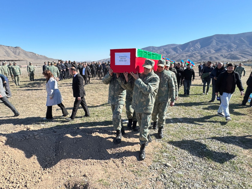 Şəhidin tabutuna bükülən Azərbaycan bayrağı onun tək övladı olan oğlu Fəxrəddin Əhmədova təqdim edilib.
