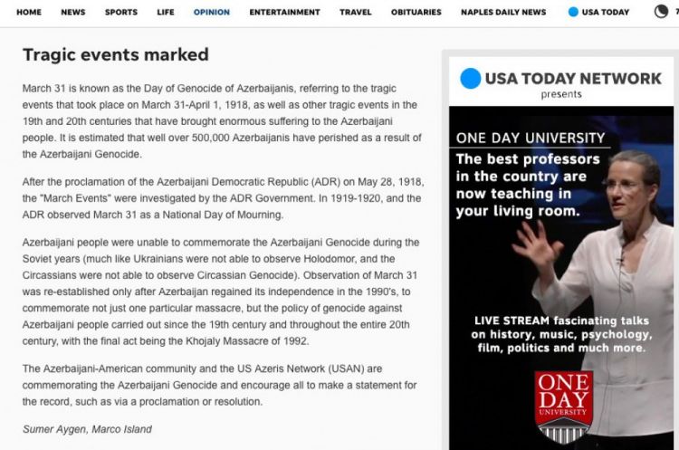 NUHÇIXAN xəbər verir ki, 1918-ci ilin martında Azərbaycanda baş vermiş hadisələrə həsr edilmiş məqalə Amerika ictimaiyyətini azərbaycanlıların soyqırımı haqqında məlumatlandırmaq məqsədilə ABŞ Azərbaycanlılar Şəbəkəsinin hər il keçirdiyi kampaniya əsasında hazırlanıb.