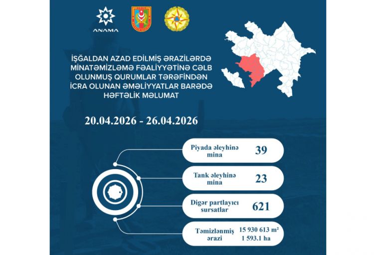 Azad olunan ərazilərdə aprelin 20-dən 26-dək 23 tank əleyhinə mina, 39 piyada əleyhinə mina, 621 partlamamış hərbi sursat (PHS) aşkarlanıb və zərərsizləşdirilib.