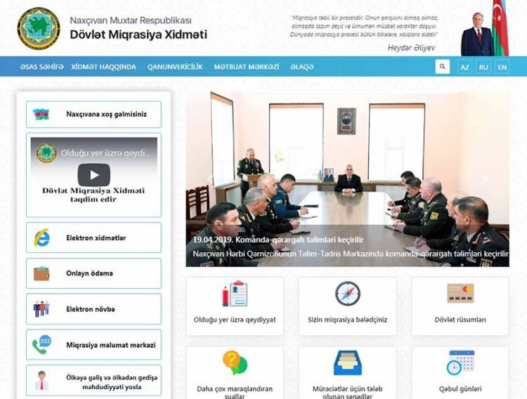 NUHÇIXAN xəbər verir ki, Naxçıvan Muxtar Respublikası Dövlət Miqrasiya Xidmətinin rəsmi saytı əcnəbilərin və ölkə ictimaiyyətinin daha rahat istifadəsi üçün cari ilin əvvəlində tamamilə yenilənib. Sayt həm funksionallıq, həm dizayn baxımından müasirləşdirilib. Xidmətin internet səhifəsi üç dildə - Azərbaycan, rus, ingilis dillərində fəaliyyət göstərir.