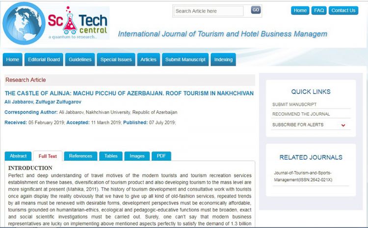 Qeyd edək ki, ABŞ-ın beynəlxalq “SciTech Central” elmi-araşdırmalar jurnalı turizm və hotel biznesi istiqmətində yazılar dərc edilən nüfuzlu dərgidir.