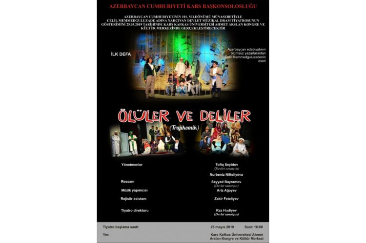 NUHÇIXAN xəbər verir ki, teatrın yaradıcı kollektivi mayın 25-də Qars Qafqaz Universitetinin konsert salonunda böyük yazıçı Cəlil Məmmədquluzadənin “Ölülər” pyesi əsasında səhnələşdirilən “Ölülər və dəlilər” tamaşasını təqdim edəcək. Azərbaycanın Əməkdar artisti Tofiq Seyidov və Nurbəniz Niftəliyevanın birgə quruluş verdiyi tamaşa ilk dəfədir ki, səhnəyə çıxarılır.