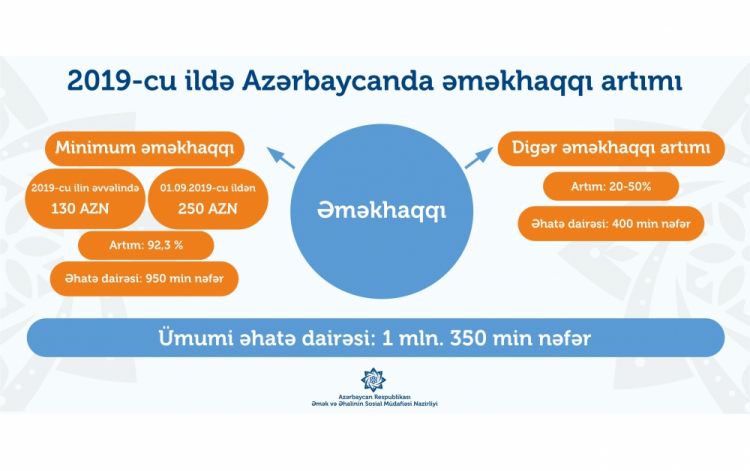 Prezident İlham Əliyevin 2019-cu il iyunun 18-də imzaladığı Sərəncamlara əsasən sentyabrın 1-dən ölkəmizdə minimum əməkhaqqı 40 faizədək artırılaraq 180 manatdan 250 manata çatdırılıb, həmçinin dövlət sektorunda çalışanların əməkhaqlarında 20-50 faiz artımlar edilib. Beləliklə, ölkəmizdə vətəndaş rifahına yönələn və 2019-cu ildə inqilabi xarakter alan sosial islahatların tərkib hissəsi kimi, bu il Azərbaycanda minimum əməkhaqqı məbləğinin 92,3 faiz artırılmasına, eyni zamanda, həmin məbləğin yaşayış minimumunu (180 manat) 40 faiz üstələməsinə nail olunub.