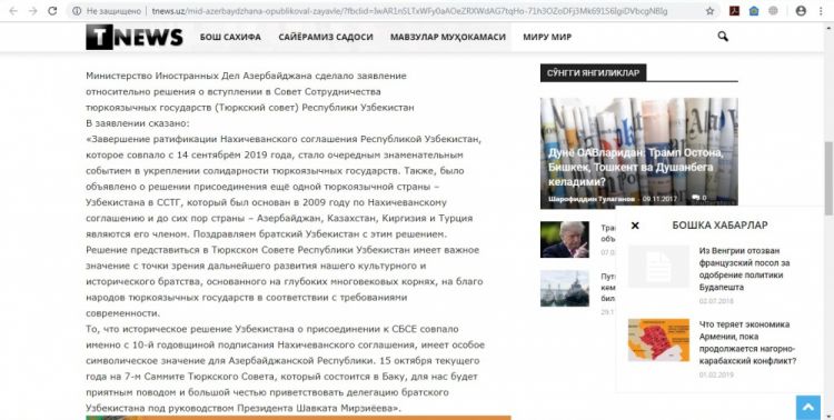 Özbəkistanın tnews.uz portalı bu ölkənin Türkdilli Dövlətlərin Əməkdaşlıq Şurasına üzv olması qərarı ilə əlaqədar Azərbaycan Xarici İşlər Nazirliyinin bəyanatını yayıb.