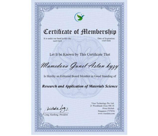 Bölmənin İnformasiya şöbəsindən NUHÇIXAN-a verilən məlumata görə, AMEA Naxçıvan Bölməsinin Təbii Ehtiyatlar İnstitutunun Sorbsiya prosesləri laboratoriyasının rəhbəri, kimya üzrə fəlsəfə doktoru, dosent Günel Məmmədova nüfuzlu beynəlxalq elmi jurnallarda dərc olunan məqalələrinin səviyyəsinə, aktuallığına görə Sinqapurun “Materialşünaslığın Tədqiqi və Tətbiqi” beynəlxalq jurnalının redaksiya heyətinə üzv seçilib.
