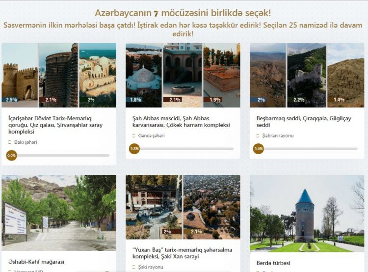 Layihə çərçivəsində növbəti ilin may ayının əvvəlində baş tutacaq son səsvermənin nəticəsində 25 namizəddən 7 qalib seçiləcək və 28 may - Respublika Günündə “Azərbaycanın 7 möcüzəsi” adına layiq görülən abidələr ictimaiyyətə elan olunacaq.