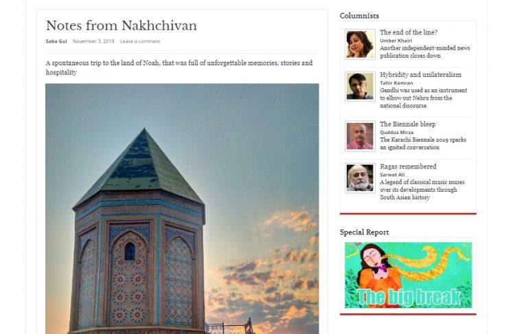 NUHÇIXAN xəbər verir ki, Pakistanın tns.thenews.com.pk saytında Naxçıvanla bağlı geniş yazı dərc olunub. Yazının müəllifi Səba Gül adında səyyahdır. O qeyd edir ki, Türkiyənin Antaliya şəhərində istirahət edərkən gəzmək üçün daha münasib bir yer axtaran zaman Naxçıvanı ona məsləhət biliblər. Oradan Naxçıvana gələn pakistanlı turist burada rastlaşdığı gözəllik və qonaqpərvərliyin vurğunu olub. “Türk dilini bilən hər kəs üçün Naxçıvanda gəzib dolanmaq çox asandır. Amma mən bir şeyi müşahidə etdim ki, burada türk dilini bilməyən çox sayda turist var və naxçıvanlılar onlarla asan və rahat ünsiyyət qururlar”- deyə pakistanlı qonaq öz təəssüratlarını bölüşür.