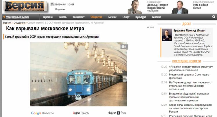 “SSRİ-də ən hay-küylü terror aktlarını Ermənistanlı millətçilər törədiblər”. Rusiyanın “Versii” nəşrində dərc olunmuş məqalə bu sərlövhəni daşıyır. Müəllif 1977-ci il yanvarın 8-də Moskvada törədilmiş və yeddi insanın ölümünə səbəb olmuş terror aktlarından bəhs edib.
