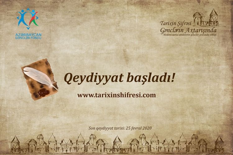 Ölkəmizin tarixinin, mədəniyyətinin dərindən öyrənilməsi və gənclərin intellektual biliklərinin artırılması məqsədilə Azərbaycan Respublikasının Gənclər Fondunun maliyyə dəstəyi ilə həyata keçirilən, XIII qrant müsabiqəsinin mədəni-tarixi abidələrin gənclər arasında təbliği istiqamətində qalib olan “Tarixin şifrəsi – gənclərin axtarışında” adlı layihə çərçivəsində respublikamızın müxtəlif bölgələrində yaşayan gənclər bir araya gələcəklər.