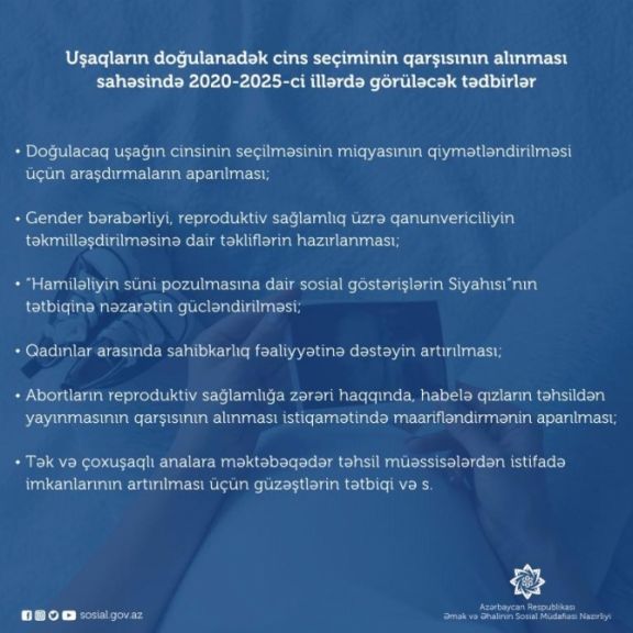 Əmək və Əhalinin Sosial Müdafiəsi Nazirliyinin İctimaiyyətlə əlaqələr və kommunikasiya şöbəsindən NUHÇIXAN-a bildiriblər ki, Tədbirlər Planı doğulacaq uşağın cinsinin seçilməsinin miqyasının qiymətləndirilməsi məqsədilə əhali arasında araşdırmaların aparılmasını, gender bərabərliyinin təmin olunması və reproduktiv sağlamlıq sahələrində qanunvericiliyin təkmilləşdirilməsinə dair təkliflərin hazırlanmasını nəzərdə tutur. Sənəddə “Hamiləliyin süni pozulmasına dair sosial göstərişlərin Siyahısı”nın tətbiqinə nəzarətin gücləndirilməsi, qızların təhsildən yayınması hallarının qarşısının alınması üçün maarifləndirmə tədbirlərinin həyata keçirilməsi, qadınlar arasında sahibkarlıq fəaliyyətinə dəstəyin artırılması, onlar üçün əmək bazarında ən çox tələb olunan peşə və ixtisaslar üzrə kursların artırılması kimi tədbirlər yer alır.