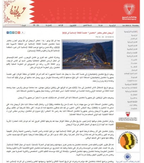 Bəhreyn Krallığının “Bahrain News Agency” (BNA) dövlət informasiya agentliyinin internet səhifəsində “Azərbaycan Naxçıvan şəhərinin 2018-ci il üçün “İslam mədəniyyətinin paytaxtı” seçilməsini qeyd edir” başlıqlı məqalə dərc olunub.