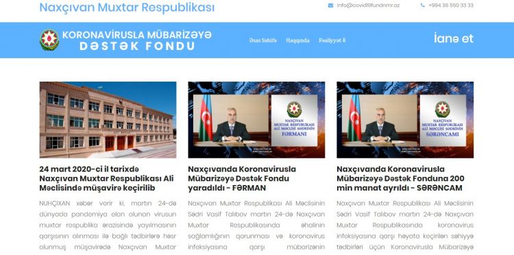 Naxçıvan Muxtar Respublikasının Maliyyə Nazirliyindən NUHÇIXAN-a verilən məlumata əsasən, martın 26-da Naxçıvan Muxtar Respublikasında Koronavirusla Mübarizəyə Dəstək Fondunun rəsmi internet saytı https://covid19fundnmr.az fəaliyyətə başlayıb.