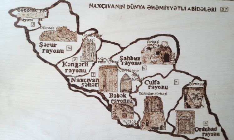 Bölmənin İctimaiyyətlə əlaqələr və İnformasiya şöbəsindən NUHÇIXAN-a verilən xəbərə görə, Tarix, Etnoqrafiya və Arxeologiya İnstitutunun Arxeoloji xidmət şöbəsinin müdiri, tarix üzrə fəlsəfə doktoru, dosent Zeynəb Quliyevanın rəhbərliyi altında Naxçıvan Qarnizonu tam orta məktəbinin 10-cu sinif şagirdləri Lamiyə Hacıyeva və Ayişə Əsgərova xəritə hazırlayıblar. Muxtar respublika ərazisində yerləşən dünya əhəmiyyətli abidələrin rayonlar üzrə sayını və yerini əks etdirən xəritə ağac üzərində yandırma üsulu ilə işlənilib, iki milli-mənəvi dəyərin sintezini-tarixi abidələrimizi və qədim sənət növünü özündə əks etdirir.