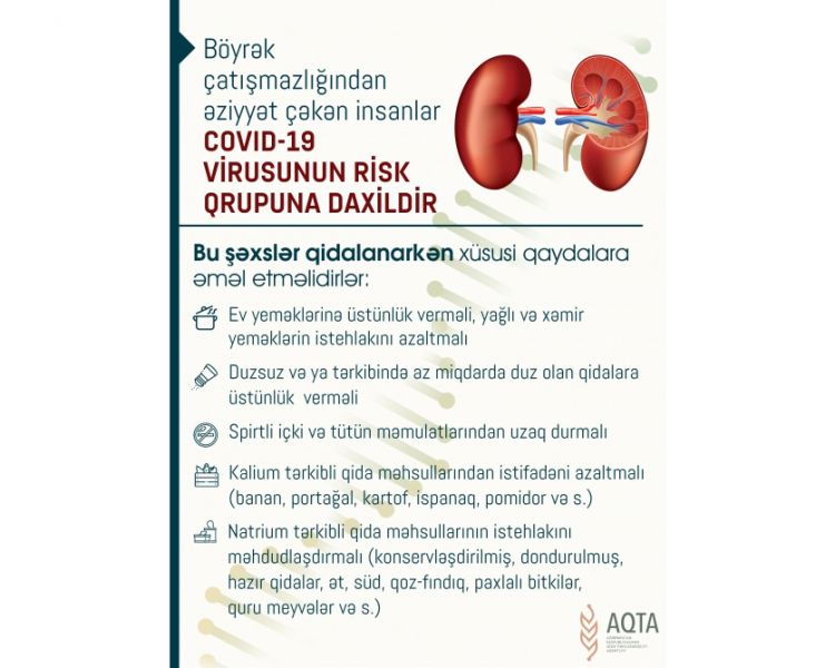 Qida Təhlükəsizliyi Agentliyinin İnformasiya təminatı və innovativ həllər şöbəsindən NUHÇIXAN İnformasiya Agentliyinə bildirilib ki, böyrək çatışmazlığının müalicəsi zamanı və ondan sonra böyrəkləri qorumaq üçün düzgün qidalanma həlledici rol oynayır. Həmin xəstəlikdən əziyyət çəkən insanlara ev yeməklərinə üstünlük vermək, yağlı və xəmir yeməklərinin istehlakını azaltmaq tövsiyə olunur. Böyrək xəstəliyindən əziyyət çəkənlərin duzsuz və ya tərkibində az miqdarda duz olan qidalara üstünlük verməsi məsləhət görülür. Onlar, həmçinin qida rasionundan spirtli içkiləri çıxarmaqla yanaşı, tütün məhsullarından da mümkün qədər uzaq durmalıdırlar. Eyni zamanda, kalium tərkibli qida məhsullarından - banan, portağal, kartof, ispanaq və pomidordan istifadə mümkün qədər azaldılmalıdır. Bundan əlavə, natrium tərkibli qida məhsullarının - konservləşdirilmiş, dondurulmuş, hazır qida və fast-fudların, eləcə də fosfor və zülal tərkibli qidaların, yəni ət, süd, qoz-fındıq, paxlalı bitkilər və quru meyvələrin istehlakı məhdudlaşdırılmalıdır.