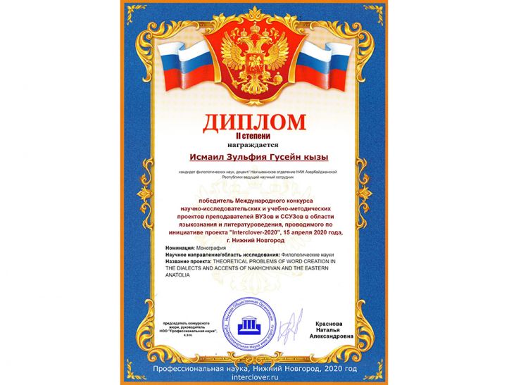AMEA-nın Naxçıvan Bölməsinin İncəsənət, Dil və Ədəbiyyat İnstitutunun aparıcı elmi işçisi, filologiya üzrə fəlsəfə doktoru, dosent Zülfiyyə İsmayıl Rusiya Federasiyası Elmi ictimai təşkilatının “İnterclover” beynəlxalq layihəsinin diplomuna layiq görülüb.