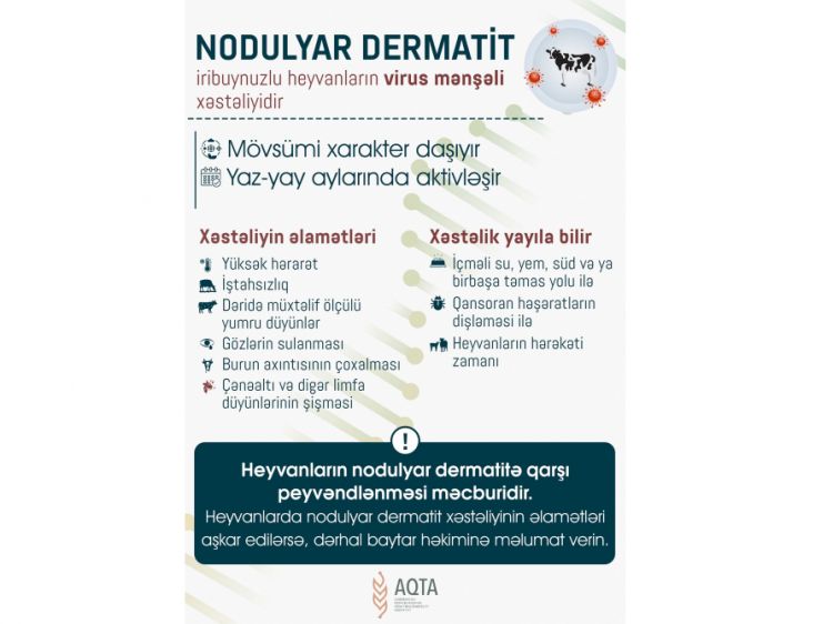 AQTA-nın İnformasiya təminatı və innovativ həllər şöbəsindən NUHÇIXAN İnformasiya Agentliyinə bildirilib ki, budəfəki maarifləndirici mövzu “Nodulyar dermatit xəstəliyi ilə mübarizə necə aparılmalıdır?” haqqındadır.
